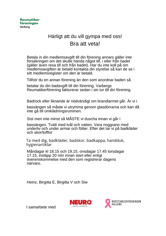 Varbergs Reumatikerförening har tillsammans med Bröstcancerföreningen och Neuroföreningen vattengympapass på Varmbadhuset och Varbergs Sjukhus, båda bassängerna har tempererat vatten.